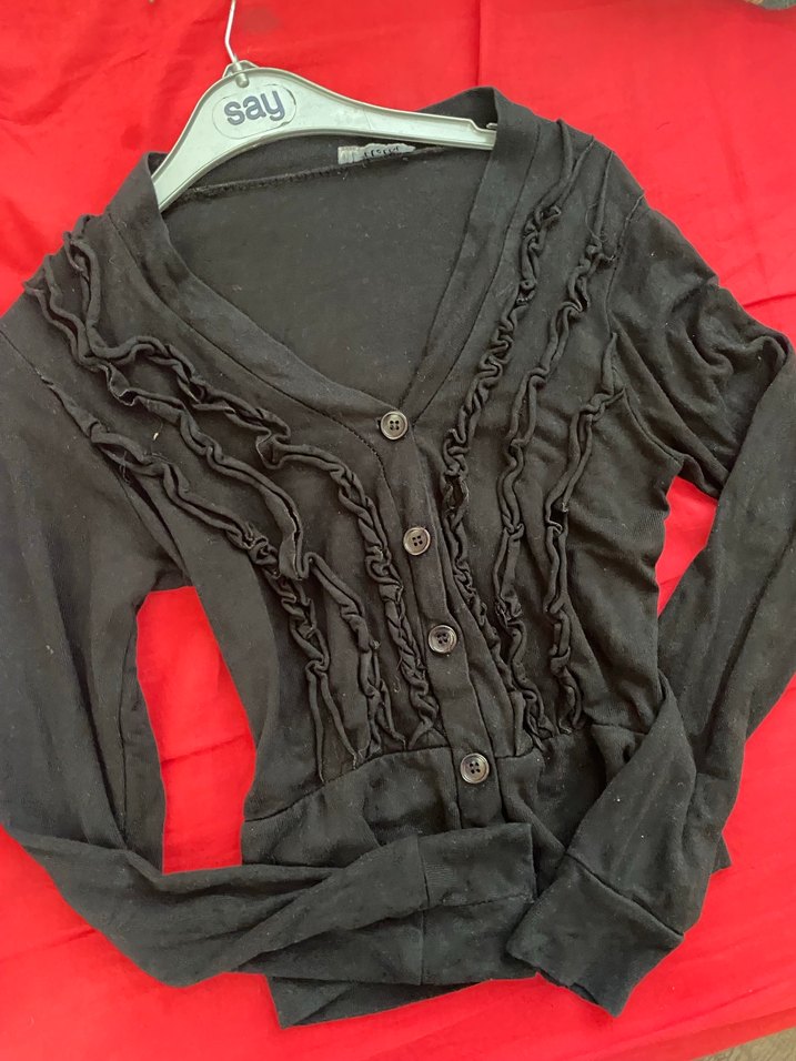 Fitted kesim siyah hırka, uzun kollu ve V yaka detaylıdır. Önde fırfır süslemeleri vardır. Keten kumaştan üretilmiş, gündelik kullanım için uygundur.
