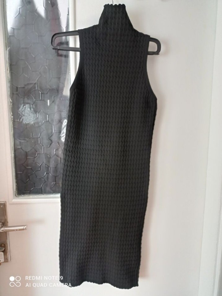 sıfır uründür.sadece etiketi yok.siyah, boğazlı, kolsuz, fit kesim triko elbise, pilili dokusuyla sokak modasına uygun. duruşu kumaşı çok hoştur.esnektir yapiya sahiptir. gögüs eni 45 cm uzunluk 94 cm.. esnektirr bilginiz olsun