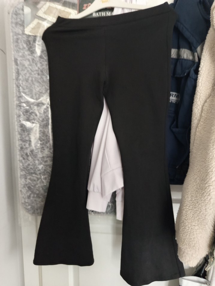 Siyah, midi boy, vücuda oturan flare pantolon. Sentetik yumuşak kumaştan, günlük rahat ve şık athleisure tarzına uygun.