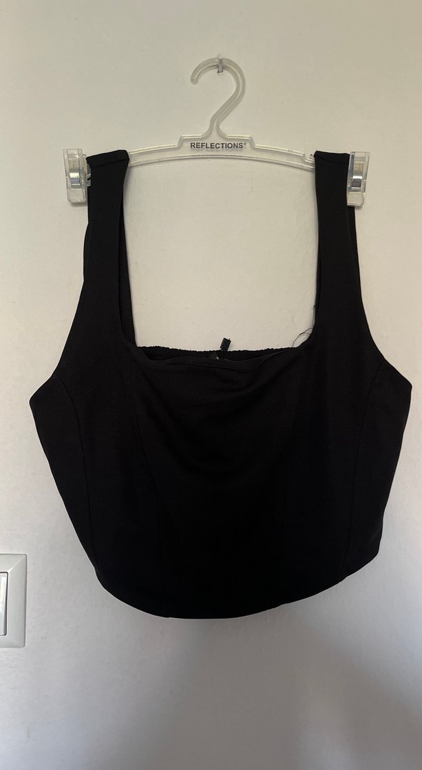 Düz siyah, tek renk, tek parça kadın göğüs korse bluz, tekne yaka ve kolsuz. Midi uzunlukta, atletik gotik tarzda, günlük kullanıma uygun.