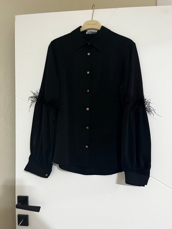 Siyah, düğmeli ve yakalı uzun kollu kadın gömleği. İpek gibi kumaştan, bol kesim .Kollarda püskül detaylı balon kollu gömlek Hediye geldiği için satıyorum 38 beden kol ve göğüs ölçüsü görsellerde olduğu gibidir