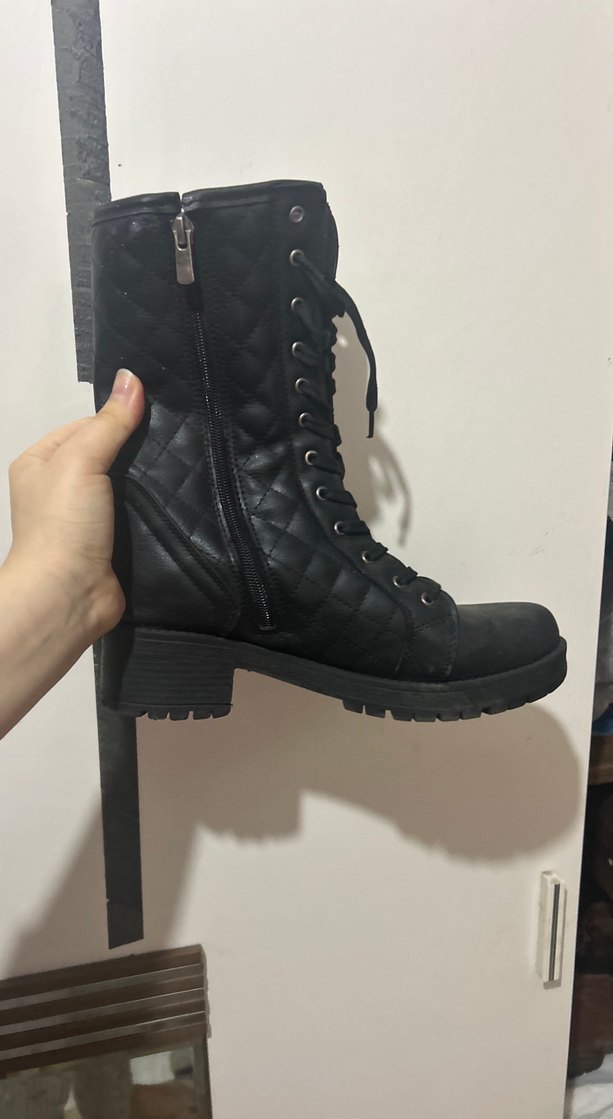 Siyah renkte, tokalı ve yan fermuarlı kadın goth botu. Kauçuk malzemeden, blok topuklu, günlük rahat kullanıma uygun.