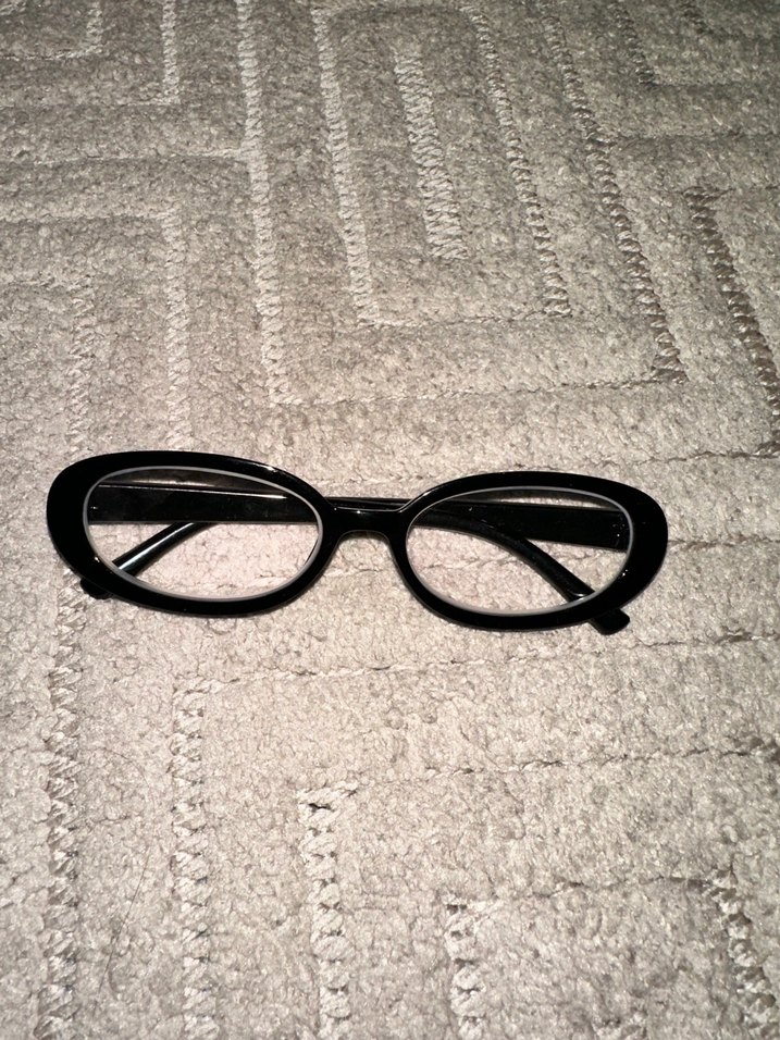 Gözlük camları numaralıdır optik cam değişebilir. Siyah, kadın gözlüğü, oval çerçeveli.
