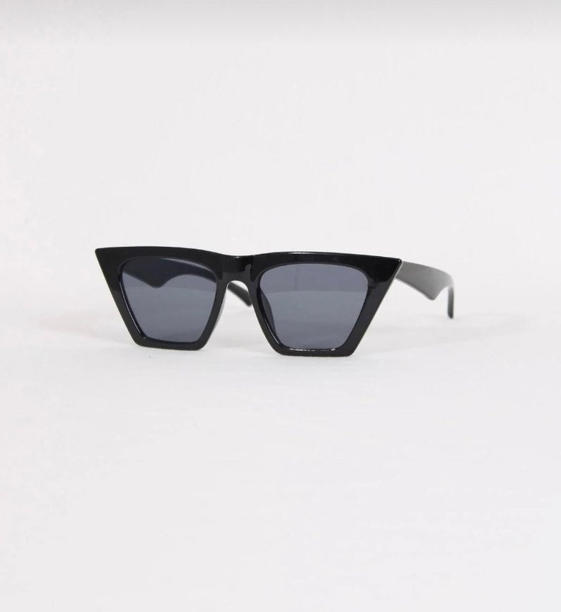 Siyah minimalist kedi gözü şekilli güneş gözlüğü, koyu renkli camlarla sade ve şık bir görünüm sunar.