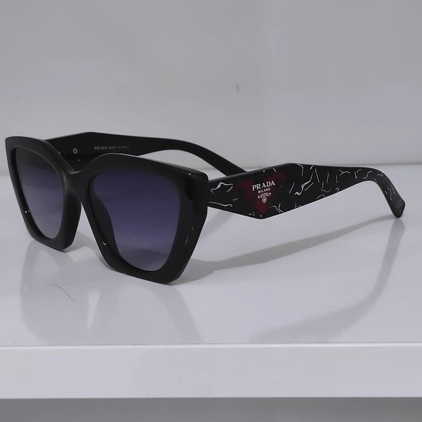 Prada'nın siyah transparan çerçeveli, koyu renk camlı kadın güneş gözlüğü, sokak modası ve avangart tarzı birleştiriyor. Yanlarda desen ve Prada logosu bulunur. ️