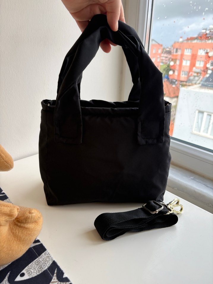 Yumuşak sentetik kumaştan yapılmış, sade tasarımlı siyah çanta, rahat taşıma için dolgulu saplara sahiptir. Günlük kullanım için çıkarılabilir askısı bulunur.