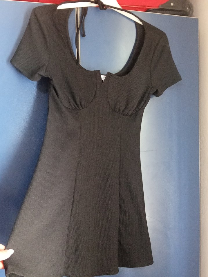 Siyah ve kısa kollu elbise, mini boy ve gündelik kullanıma uygundur. hic giyilmedi