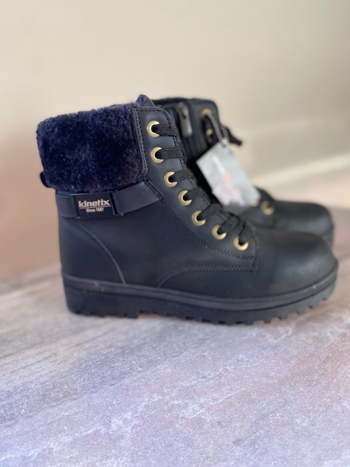 Siyah renkli, dolgu topuklu ve kemerli kadın botu. Yumuşak ve sıcak kumaş astar ile günlük sokak stiline uygun.