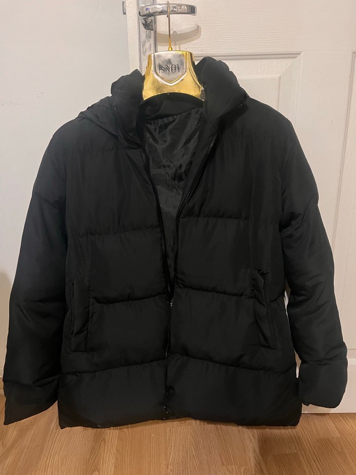 Siyah, fitted kesim kışlık mont, fermuarlı ön ve uzun kollu. Yumuşak ve sıcak kumaştan, notched lapel yakalı, midi boyda, günlük sokak stili için uygun.