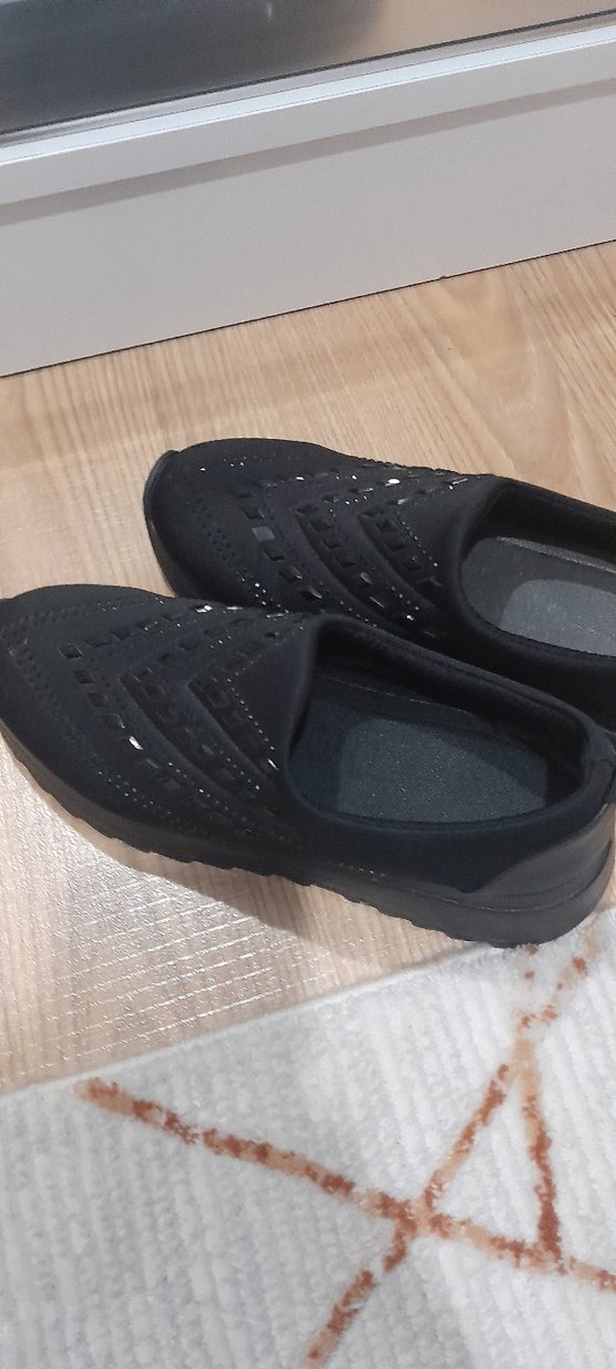 Siyah, lastik malzemeden yapılmış, taşlı şık kadın ayakkabısı. Günlük rahat ve sportif tarzda uygundur.