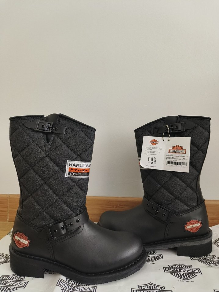 Harley Davidson markalı siyah kadın biker bot, tokalı, blok topuklu ve kapitone üst yüzeye sahip, rahat bir his sunar. Günlük kullanıma uygundur.