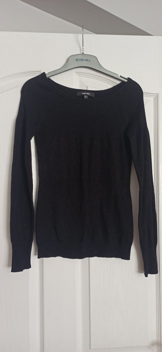 Siyah, ince örgü kumaştan, uzun kollu ve bisiklet yakalı, rahat ve got tarzı yansıtan dar kesim bir kazak, sayılı kullanıldı sorunsuz