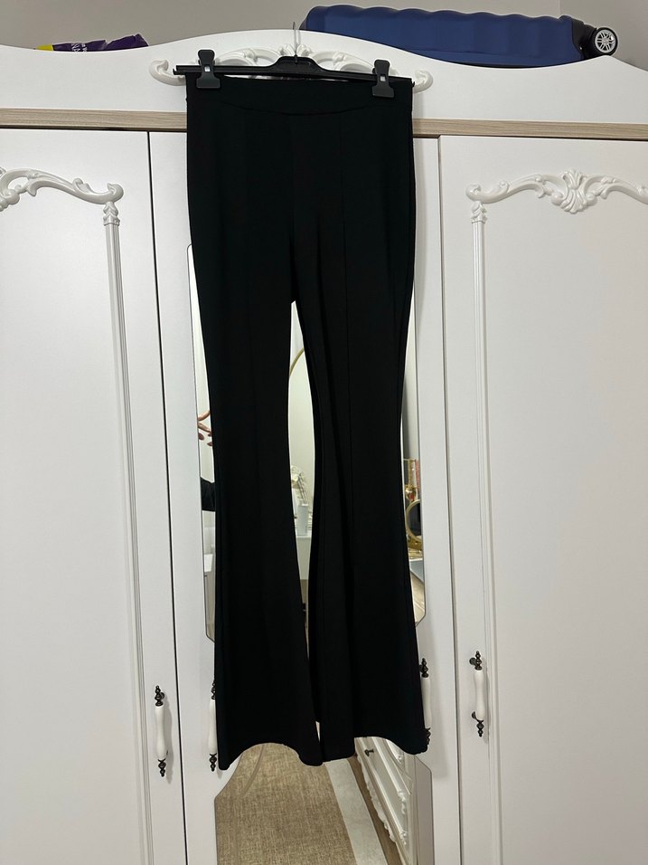 Siyah, ispanyol paça ve yırtmaçlı, ipeksi dokulu, ofis için uygun, trend ve rahat tarzda kadın pantolonu. Bir kaç kes giyildi yeni ve temizdir.