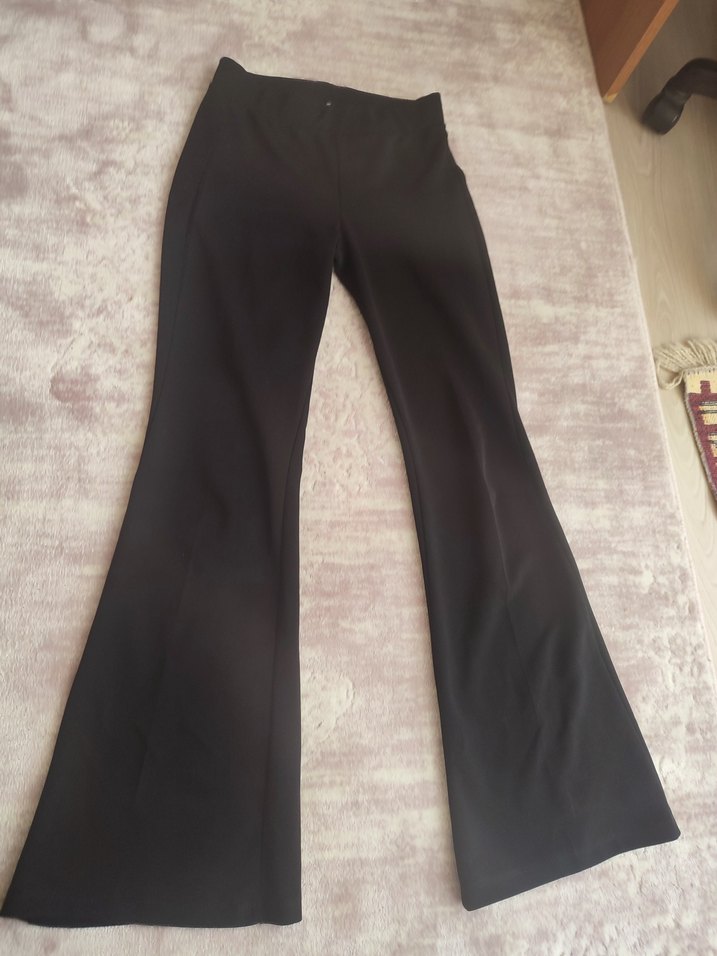 Düz siyah, midi boy, ispanyol paça kesim, sentetik kumaştan, rahat ve şık ofis pantolonu. Trendy casual ve athleisure stil için ideal.