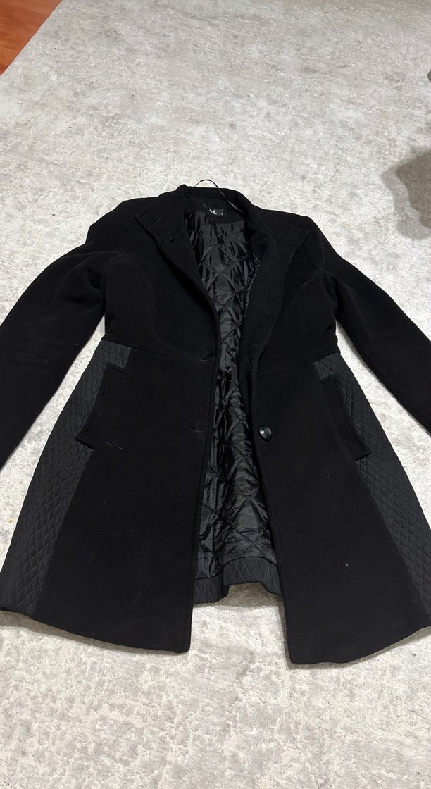 Siyah kadın kaban, kapitone astar ve yan panellerle tasarlanmıştır. Tek düğmeli kapanış ve iki ön ceplidir. Sıcak tutar ve şık görünür.