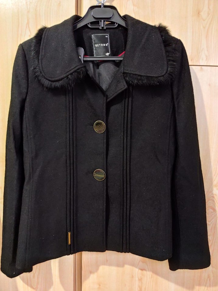 Büyük yakalı ve kürk detaylı siyah kadın kaban, iki düğmeli ve dikey dikiş detaylarına sahip. Soğuk havalar için sıcak ve şık.