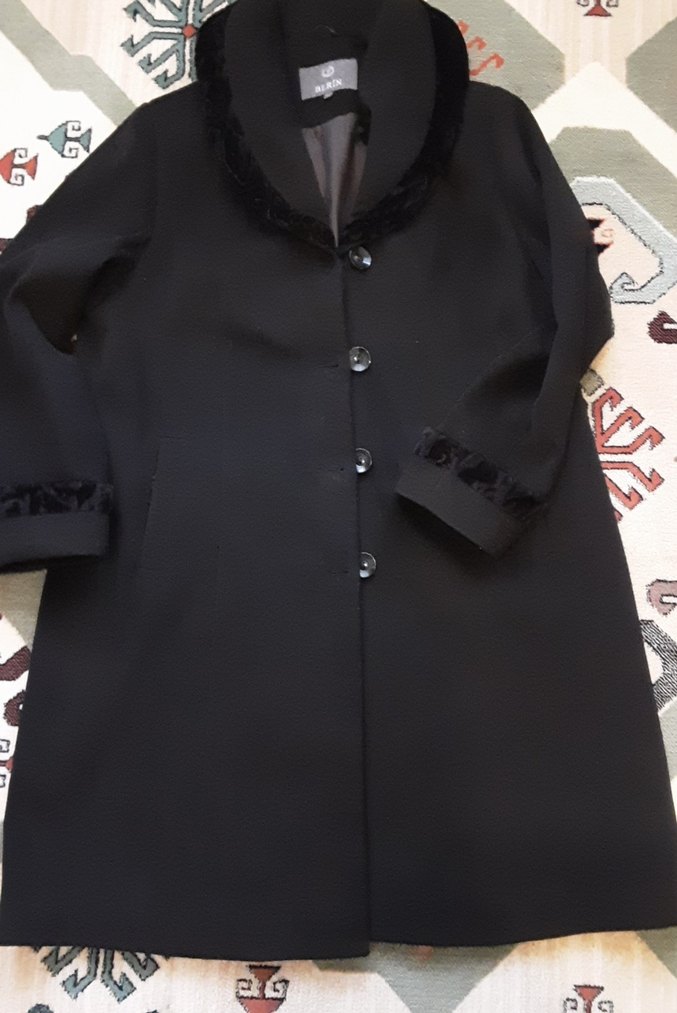 Düğmeli, siyah kadın kaban, kürklü yaka ve manşet detaylarıyla klasik ve şık bir görünüm sunar. bazı yerlerinde tuycuklenme vardır annene montu kaliteli bir kumaşı var göğüs 55 cm boyu 95 cm alt kısmı 65 buçuk