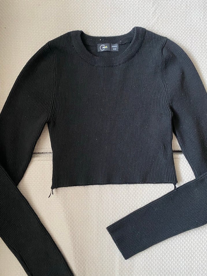Siyah, kalın triko dokulu, bisiklet yaka ve uzun kollu, normal midi boyda, minimalist tarzda kadın sweatshirt.