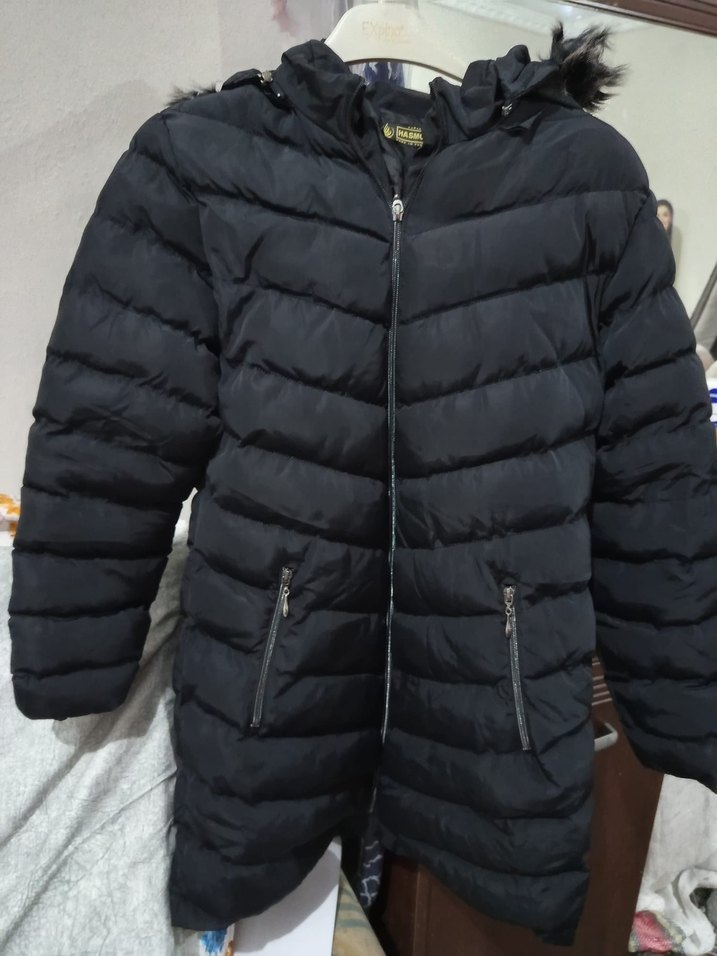 Siyah, kapüşonlu, kürklü detaylı, midi boy, uzun kollu, fitted kesim kışlık mont. Yumuşak ve sıcak kumaştan, günlük sokak stili için ideal.
