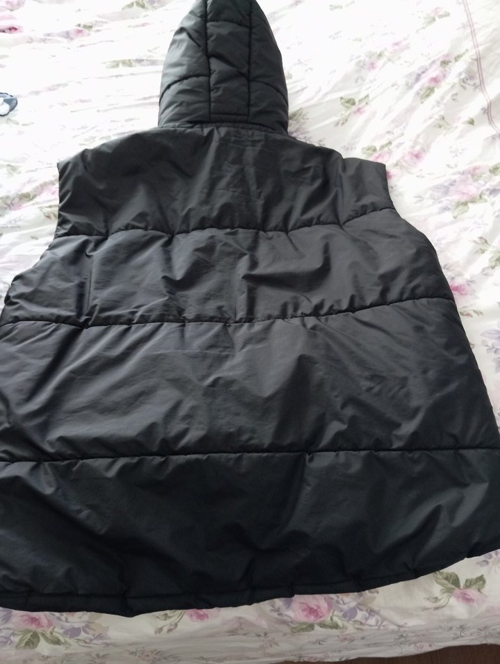 Siyah renkte, kapüşonlu ve fermuarlı kadın şişme yelek. Kolsuz, dar kesim ve sıcak tutan yumuşak kumaşlıdır.