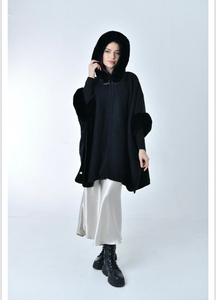 Siyah, uzun boylu ve bol kesim olan bu poncho, uzun kollu ve kapüşonludur. Kol ve kapüşon kısmında kürk detayları bulunur, yumuşak ve sıcak dokudadır. İstediğiniz model için ayrı bir ürün açacağız mesaj ile bildiriniz. STANDART BEDEN