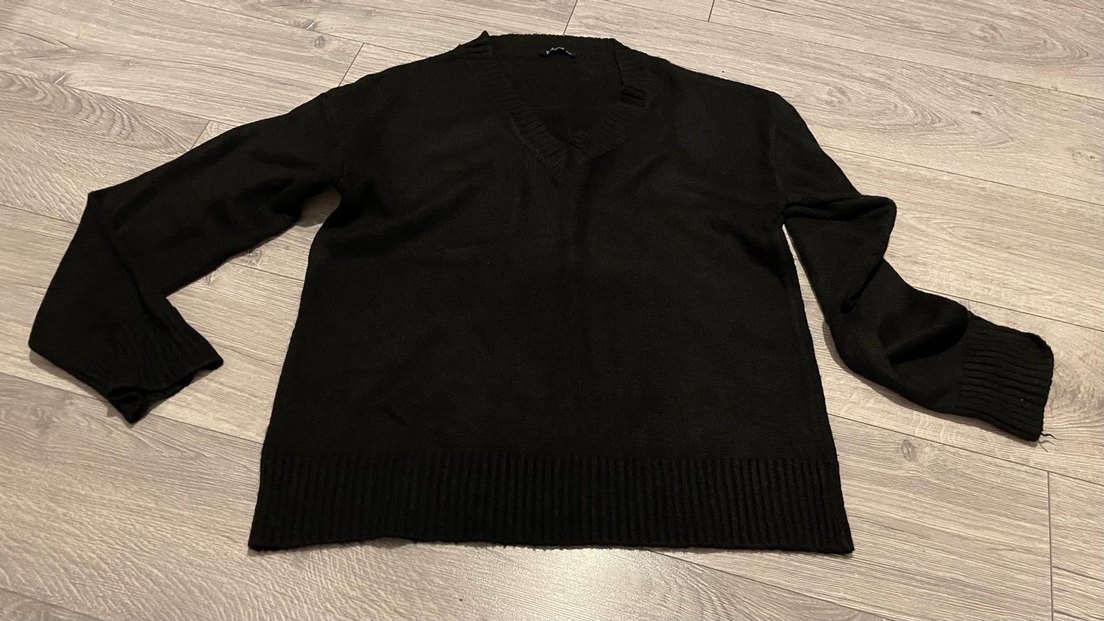 Siyah renkte, v yaka ve uzun kollu salaş kesim kadın kazak. Yumuşak sentetik kumaştan üretilmiş, günlük kullanıma uygun sade ve rahat bir model.