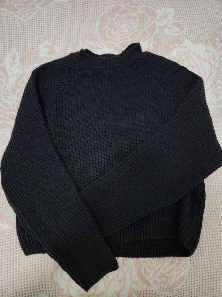 Siyah örgü kazak, bisiklet yaka ve uzun kolludur. Desensiz, sade tasarımı günlük kullanım için uygundur.