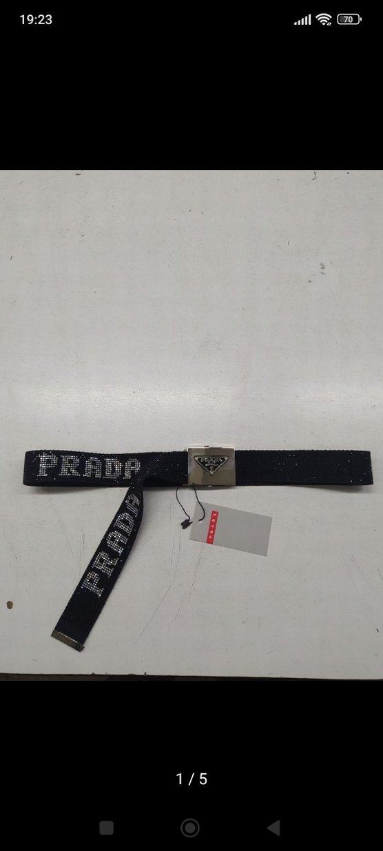 Siyah renkli, belden bağlamalı kadın kemeri. Üzerinde PRADA logosu ve gümüş tokası bulunur. Trend sokak stili için uygundur.