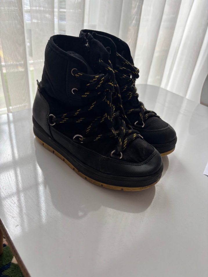Siyah, kemerli ve nakış detaylı kadın botları dolgu topuklu ve kauçuk malzemeden üretilmiştir. Günlük sokak stili için uygundur.