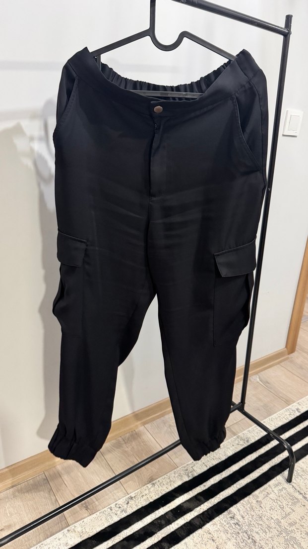 Siyah, kemerli ve rahat kesimli kadın pantolonu, ipeksi kumaştan. Midi boyda, günlük kullanım için uygun, sokak stiline uygun. ✨ Bel 42 cm Boy 96 cm Lastikli paça