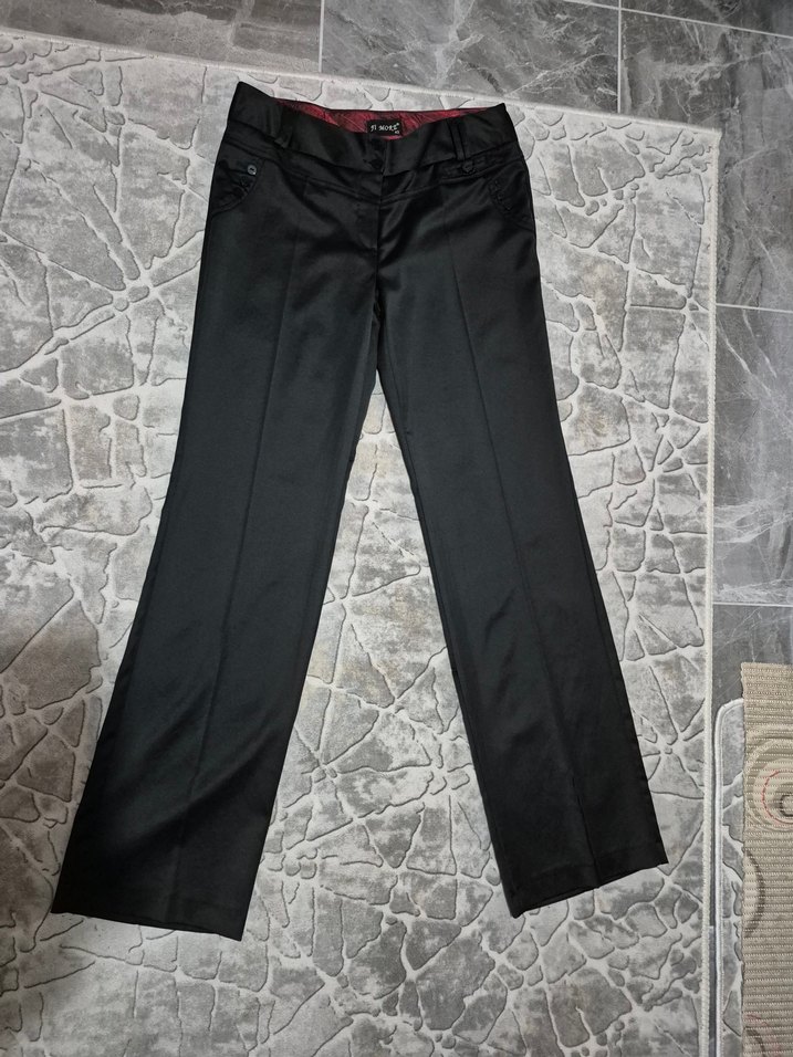 Siyah, kemerli ve Saten ipeksi dokulu kadın kumaş pantolon. Normal boy, regular fit, ofis ve şık günlük kombinlere uygun.