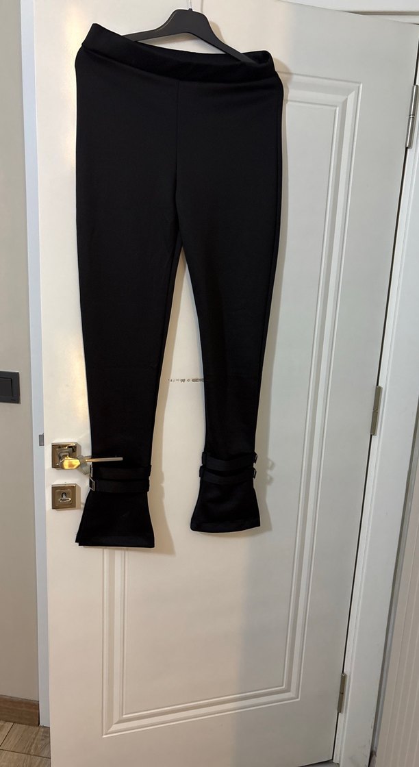 Kemerli, siyah, dar kesim kadın pantolon. Yumuşak ve sıcak kumaştan, midi boy, ofis ve günlük kullanıma uygun.