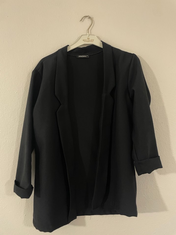 Siyah keten kumaştan, notched lapel yakalı ve uzun kollu, midi uzunlukta, rahat kesim kadın blazer ceket. İş ve günlük şıklık için uygun, desensiz tasarım.