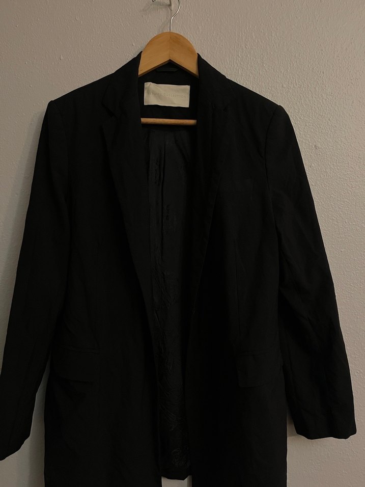 Siyah keten kumaştan, uzun kollu, notched yakalı, normal kesim midi uzunluğunda kadın blazer ceket. Ofis için sade ve desensiz tarzda. Arka kısımda iz var kuru temizlemede halledilebilir. Birçok blazerım var o yüzden kuru temizlemeye vermedim. 42 bedene kadar kullanabilirsiniz