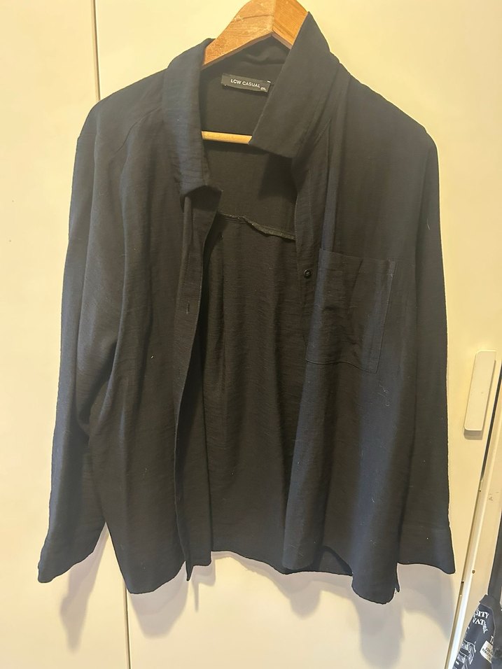 Siyah keten, bol kesim, uzun kollu, yakalı ve düğmeli kadın gömleği. Normal midi boyda, ofis için uygun.
