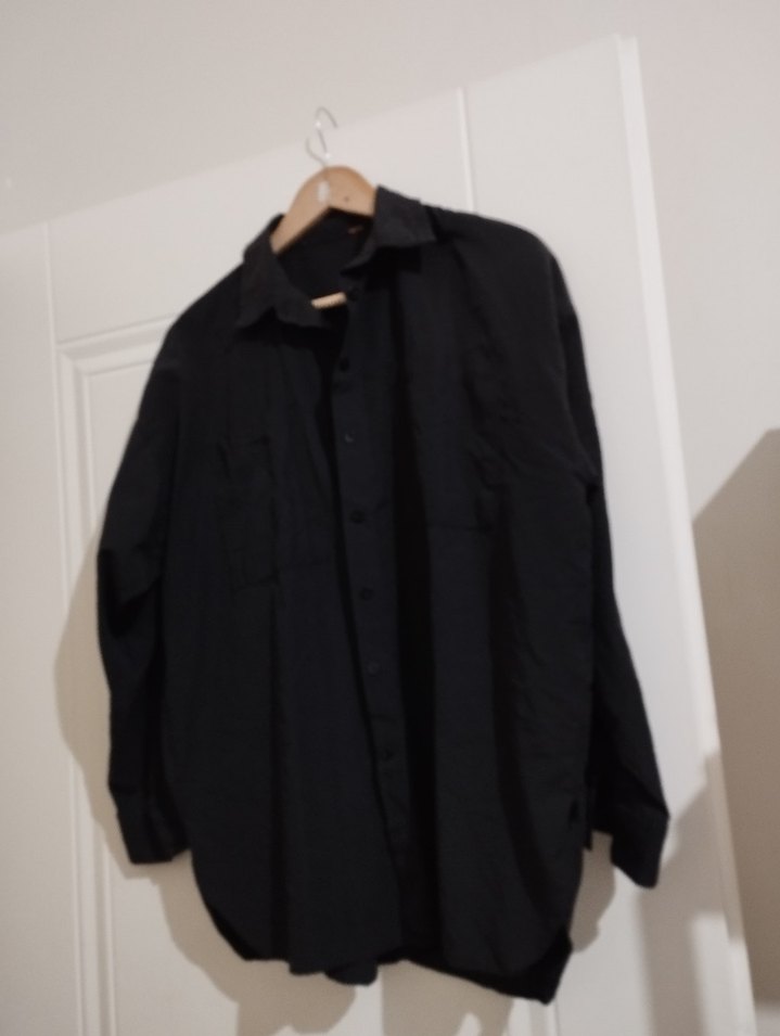 Düğmeli, uzun kollu, keten kumaştan siyah, notalı yakalı bol kesim gömlek. Minimalist tarz için uygundur.