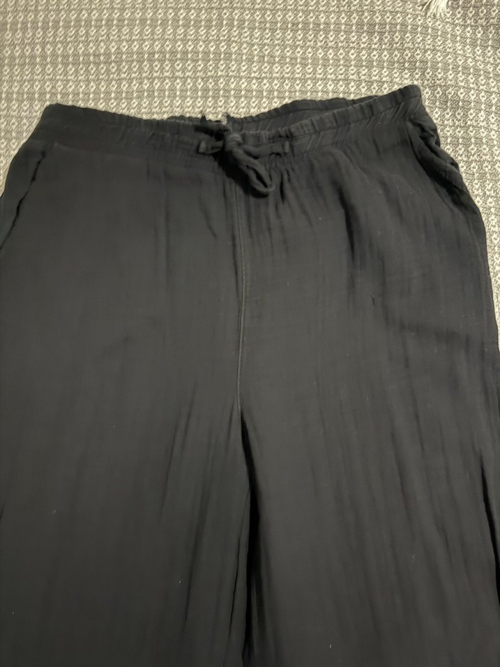 Siyah keten kumaştan, bol kesim ve midi boyda kadın pantolonu. Pilili detaylı ve bağcıklı bel, günlük sokak stiline uygun.