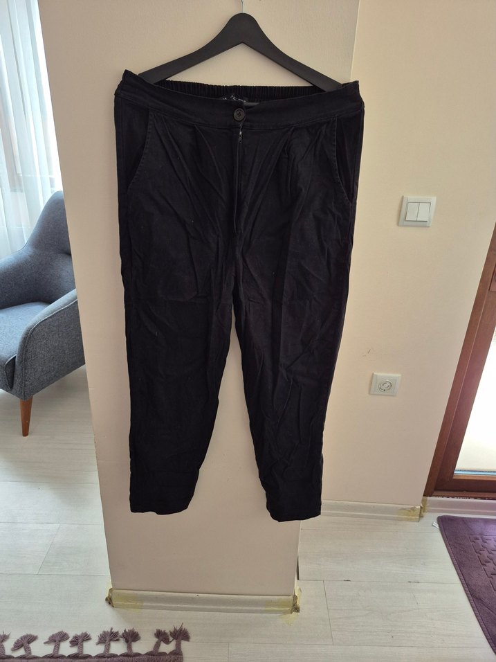 Siyah keten kumaştan, rahat kesim ve midi boyda kadın pantolonu. Dış mekan için trend ve zahmetsiz şıklık sunar.