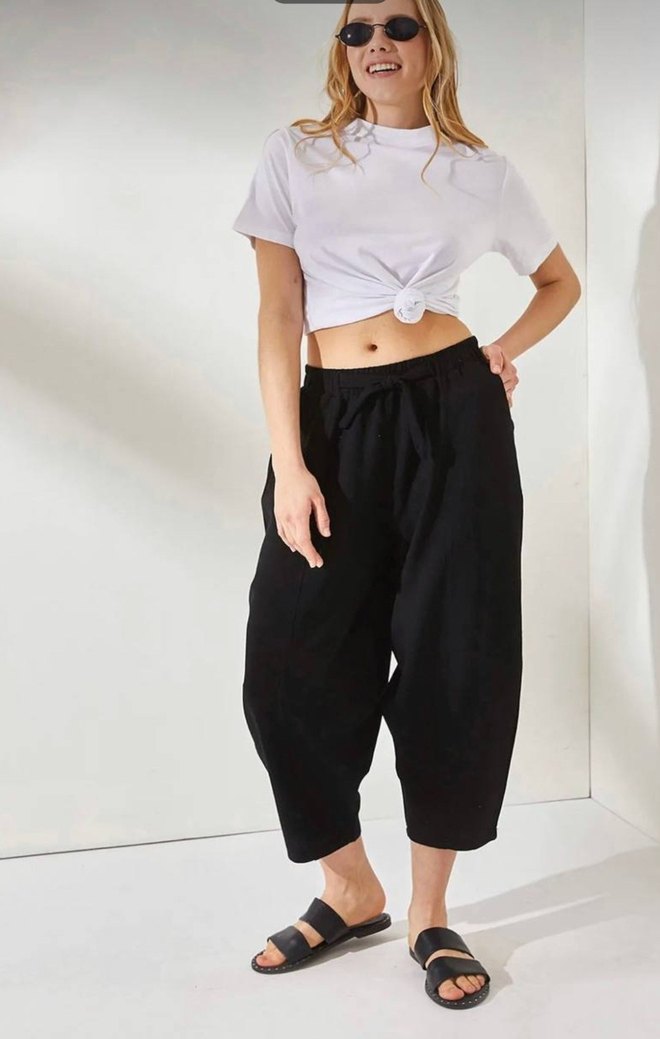 Siyah keten kumaştan yapılmış, salaş ( balon ) kesimli ve midi boyda kadın pantolonu. Günlük kullanıma uygun, rahat ve şık bir tasarıma sahiptir. S /1 tane M/1 tane Xlarge / 1 tane