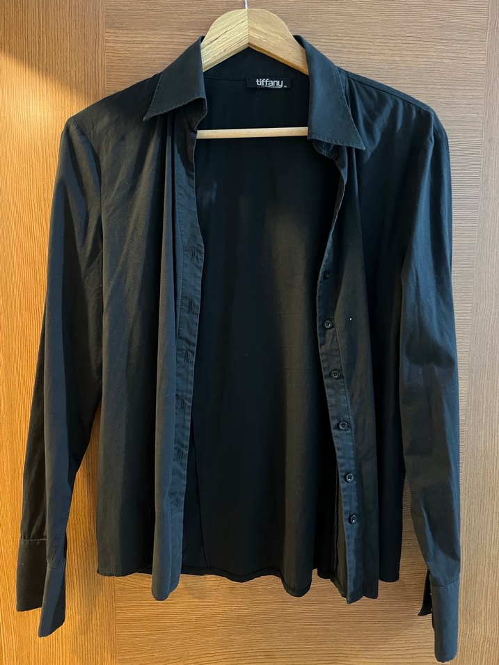 Siyah keten gömlek, yaka kısmında kesimli detay ve düğmeli ön tasarıma sahiptir. Uzun kollu ve normal kesimdir, iş ve günlük stil için uygundur.