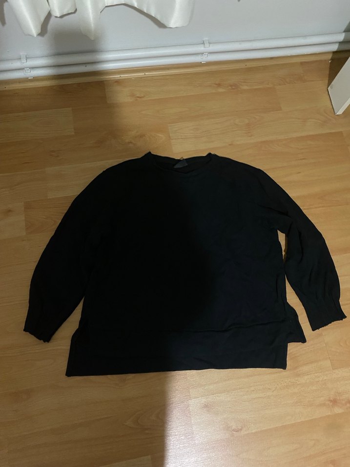 Siyah, uzun kollu, yuvarlak yakalı keten kumaştan kadın kazak. Rahat kesimli ve normal boyda, günlük kullanıma uygun minimal ve sade stil sunar. Defosu yok kolları büzgülü şık üst