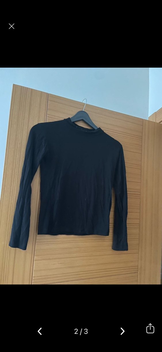 Siyah, keten kumaştan, uzun kollu ve bisiklet yaka, normal midi boyda, minimal ve şık bir kadın sweatshirtü.