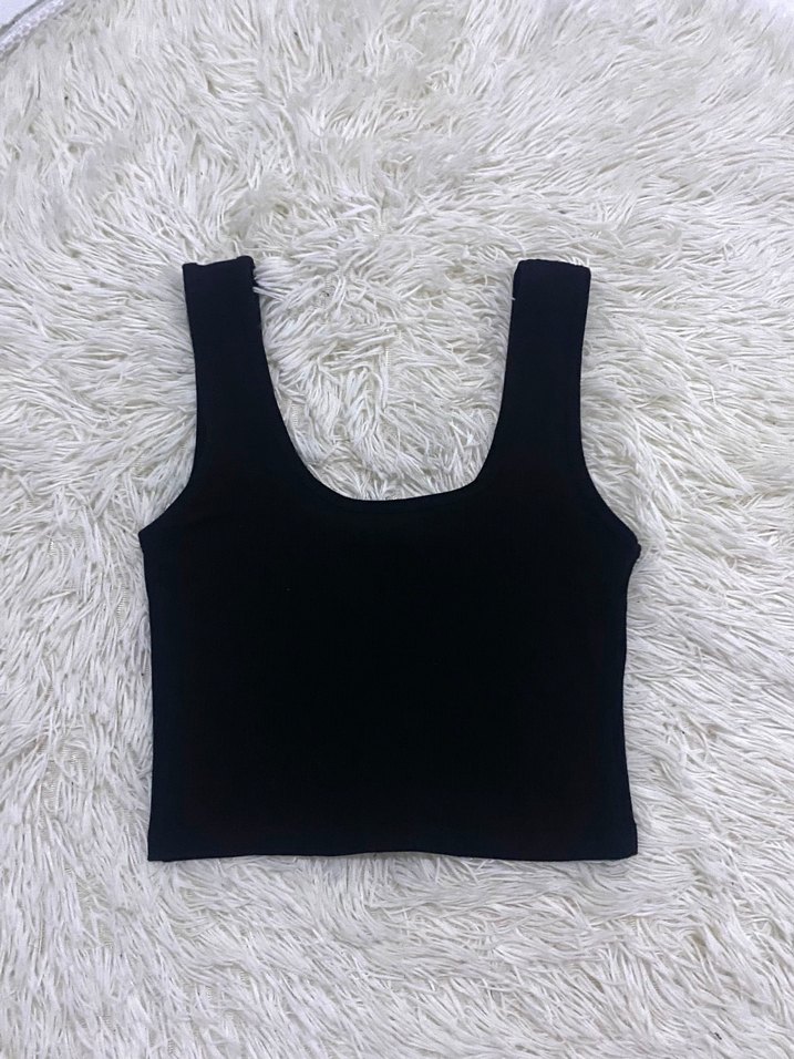 Siyah, kolsuz, tek renk ve kısa kesim crop top. Yumuşak sentetik kumaştan üretilmiş, rahat ve günlük kullanım için uygun.