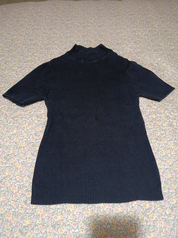 Kısa kollu ve boğazlı, siyah renkli, vücuda oturan normal uzunlukta yumuşak triko kumaştan kazak.