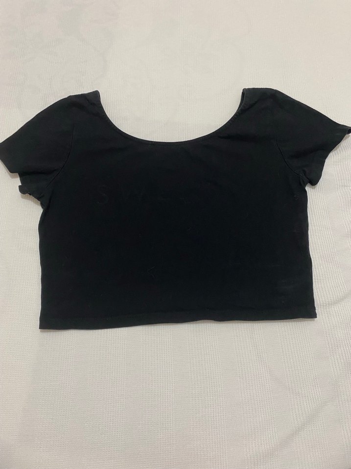 Siyah, kısa kollu ve tek renkli crop top, tekne yaka ve vücuda oturan kesime sahip. Günlük kullanıma uygun, yumuşak sentetik kumaştan yapılmış minimalist goth tarzı. Boy 38 , göğüs 42 cm