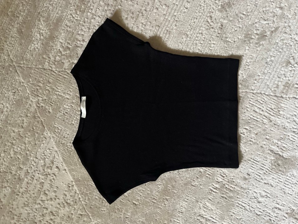 Siyah, kısa kollu, kayık yaka, dar kesim kadın T-shirtü, yumuşak sentetik kumaştan. Minimalist ve gotik tarzda, günlük kullanıma uygun. Ürün kullanılmadı,crop