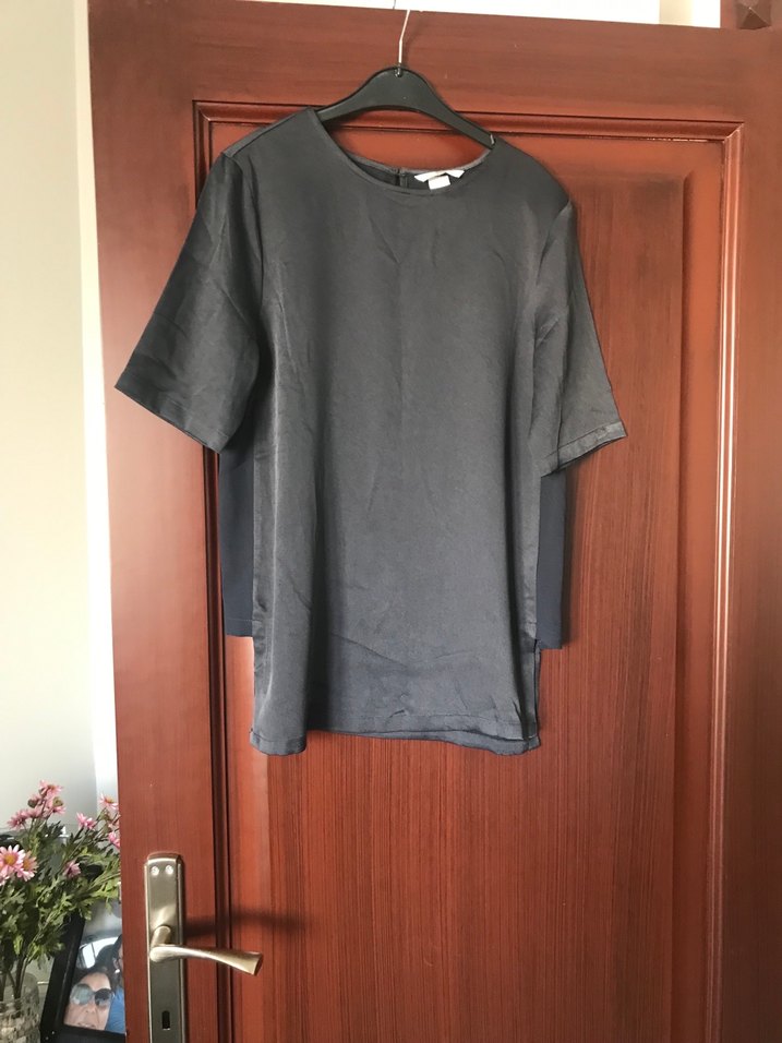 Siyah, kısa kollu, yuvarlak yakalı, salaş kesim, midi boy ve ipeksi dokulu kumaştan yapılmış kadın bluz. Minimalist, normcore tarzda, günlük rahat kullanıma uygun. Boy 62 cm iki kol arası 43 cm %100 polyester tek antrasit