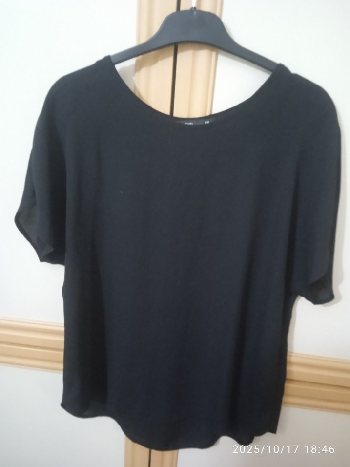 Siyah, kısa kollu, yuvarlak yakalı ve salaş kesim, ipeksi kumaştan günlük kullanıma uygun midi uzunlukta sade kadın bluz.