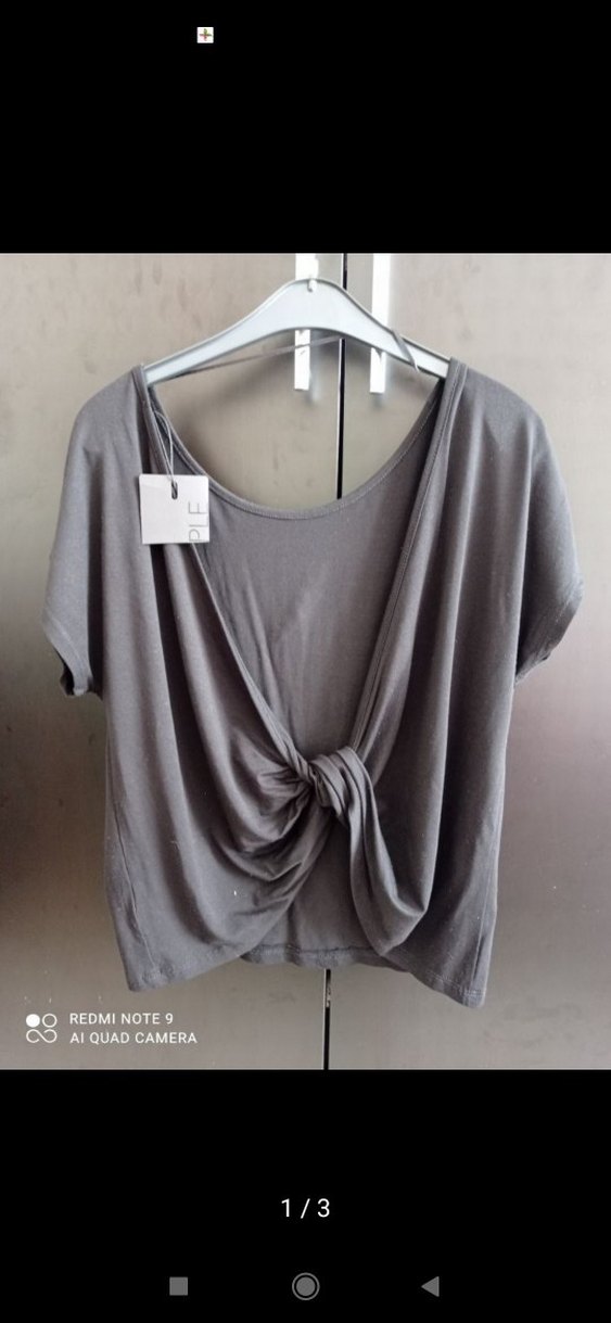 siyah pamuklu kumaştan, kısa kollu, yuvarlak yaka, salaş kesim ve drapeli düğüm detayı bulunan kadın tişörtü, kısa boyda ve günlük sokak stiline uygun.