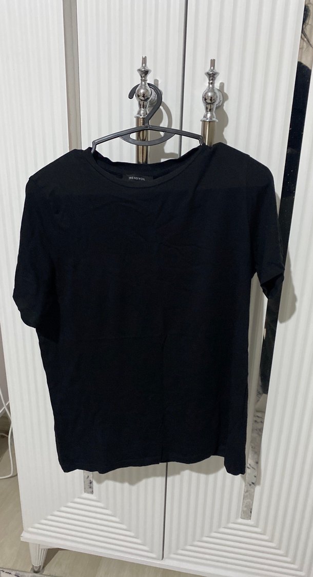 Siyah renkte, kısa kollu ve yuvarlak yakalı bu kadın tişörtü, salaş kesimi ve ipeksi dokusuyla günlük kullanıma uygundur.